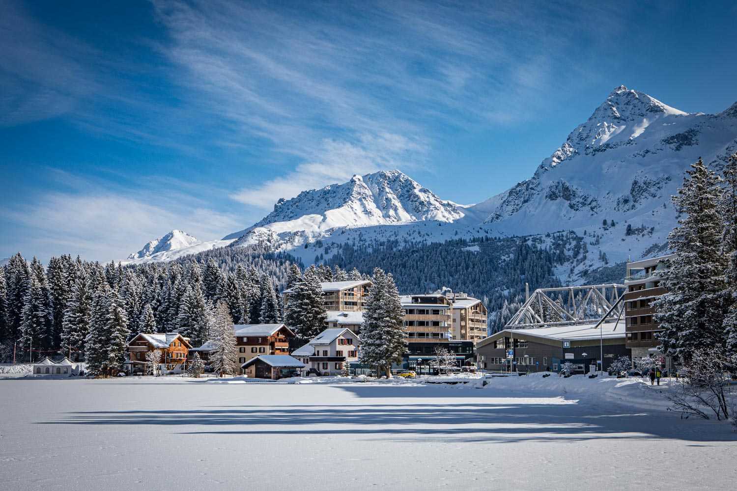 Arosa, herrlich eingebettet in eine Schweizer Winterlandschaft aus schneebedeckten Bergen und zugefrorenem See.