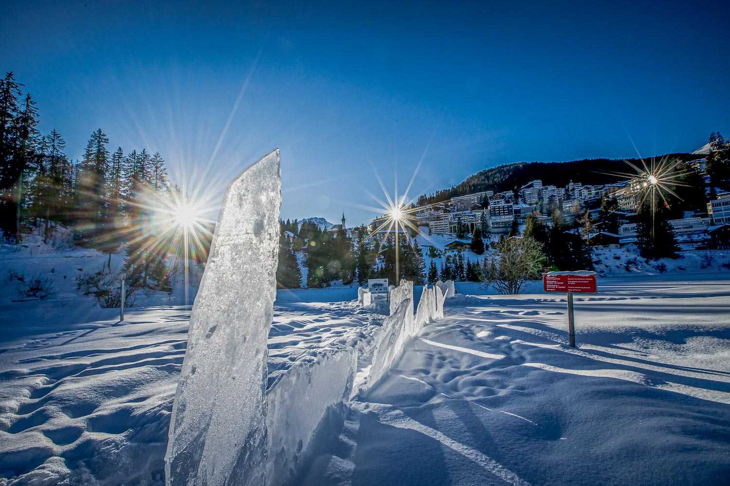 Jeden Wintermorgen wird das Eisbecken von seiner eisigen Decke befreit. So wächst der Skulpturenpark aus zahllosen Eisschollen Tag für Tag weiter (Foto: Eisbadi Arosa).