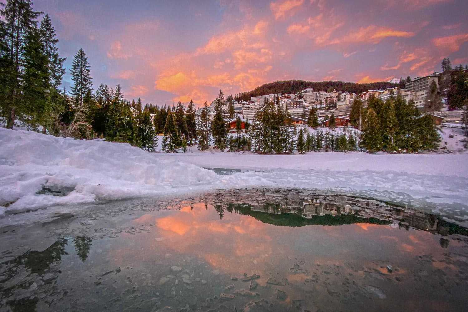 Das Eisbadi in der aufgehenden Sonne Arosas (Foto: Eisbadi Arosa).