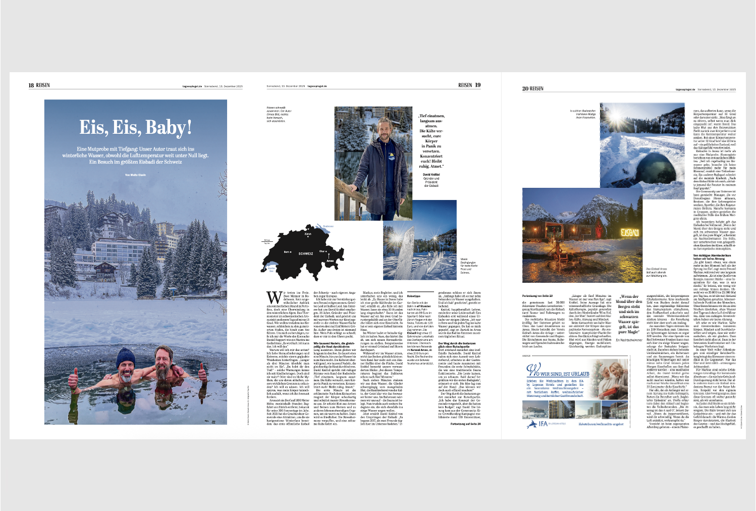 Wir treten ins Freie. Zwei Männer in Badehosen. Kein ungewöhnlicher Anblick am sommerlichen Strand in Portofino, doch eine Überwindung in den winterlichen Alpen. Das Thermometer im schweizerischen Arosa sinkt an diesem Tag auf minus 13 Grad. Wir wollen trotzdem ins Eiswasser, schleichen zu den gummierten Stufen, die hinab zum See führen. Um mich zu beruhigen, rufe ich mir die Worte des Eiscoachs Daniel Ruppert wie ein Mantra ins Gedächtnis:
