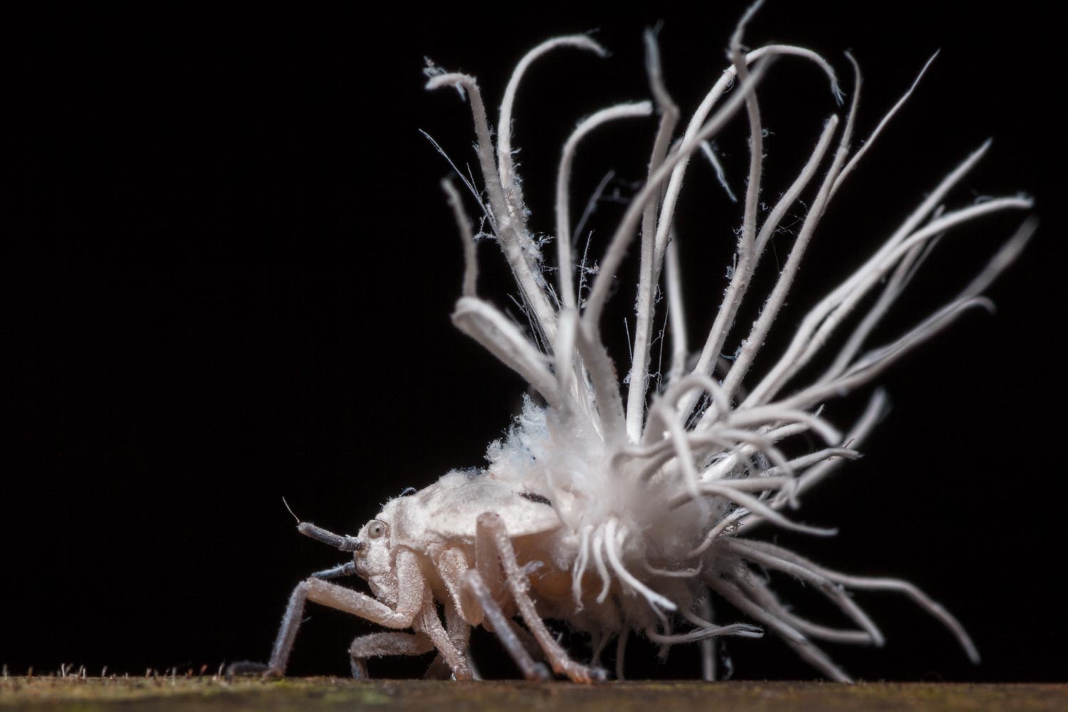 My jungle favorite! The so-called planthooper. When I saw it the first time, I thought 'That's a little flower blossom'. But suddenly it moved away. I couldn't believe my eyes! These guys move fast, and are hard to capture. And they're small! A bit bigger than a thumb nail.